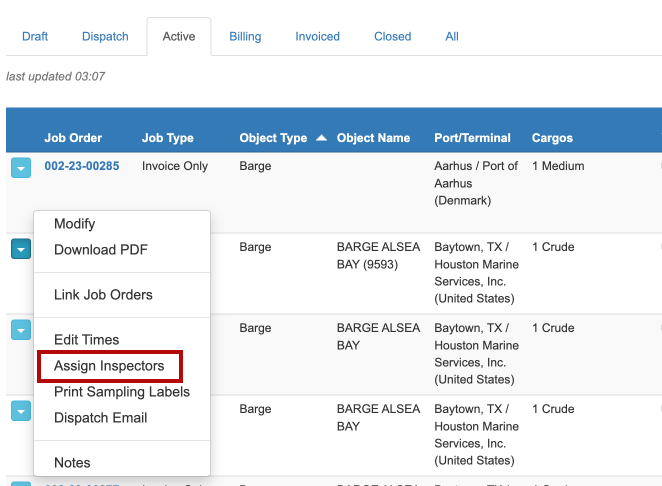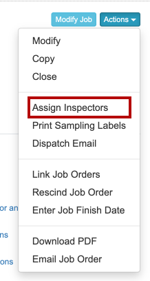To assign an inspector to a Job Order, ensure that the user has dispatching permission and select Assign Inspectors beside the Job Order's number in the list: