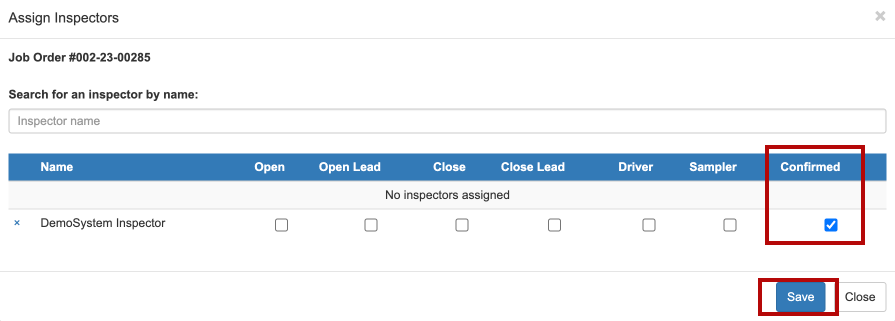 To assign an inspector, select the Confirmed check box for the inspector and click Save: